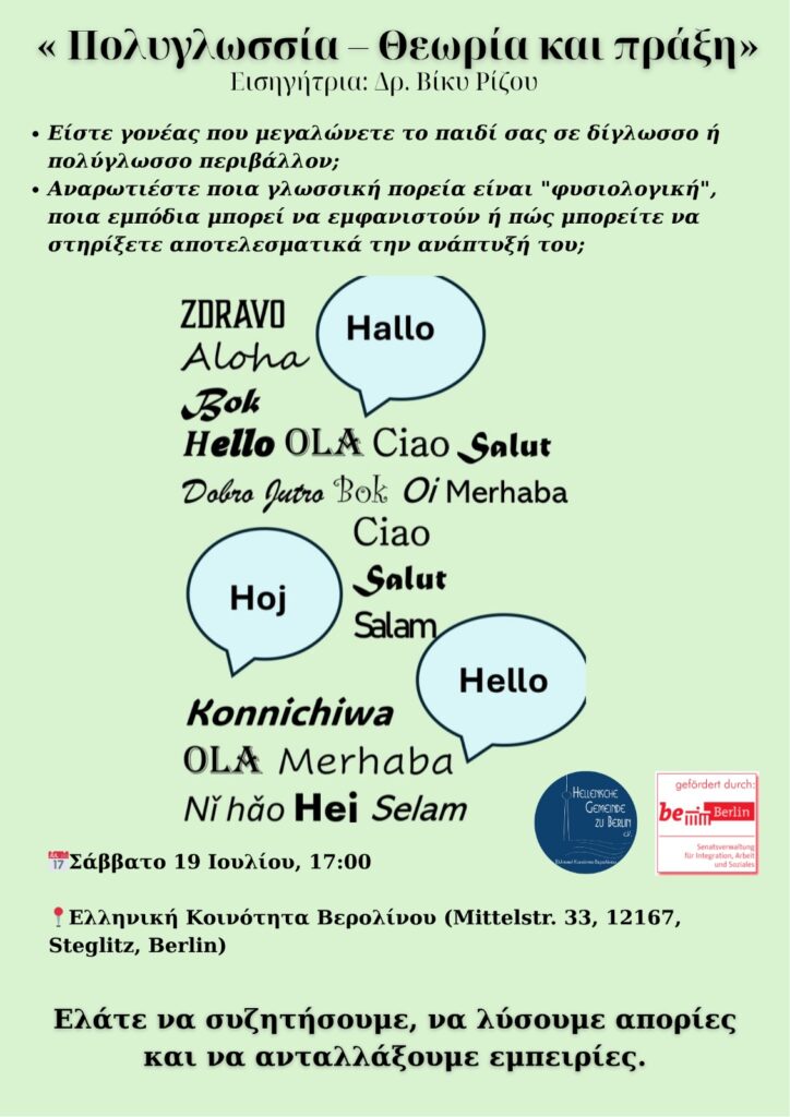Η Ελληνική Κοινότητα Βερολίνου διοργανώνει μια διαδραστική συνάντηση με τίτλο: «Πολυγλωσσία – Θεωρία και πράξη», με στόχο την ενημέρωση, την απομυθοποίηση και τον γόνιμο διάλογο γύρω από την ανάπτυξη των γλωσσών στα παιδιά και τους εφήβους.