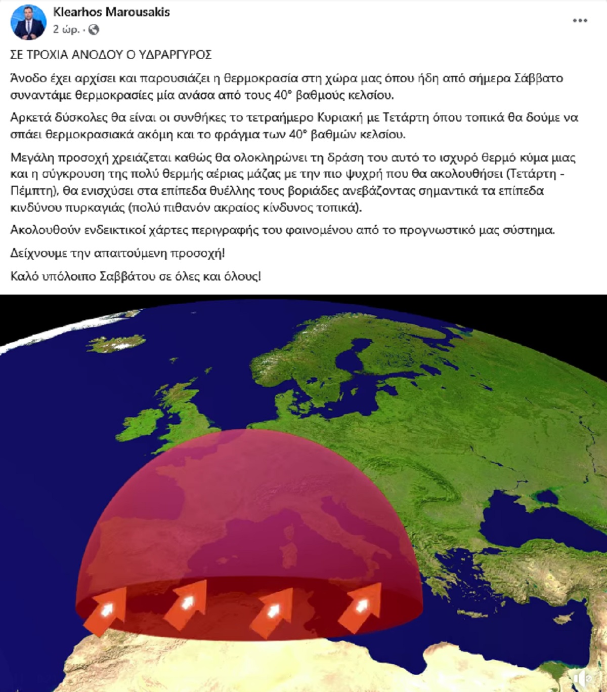 Αυτό επισημαίνει με ανάρτησή του ο μετεωρολόγος Κλέαρχος Μαρουσάκης ο οποίος με ανάρτησή του στο Facebook αναφέρεται στον καύσωνα των επόμενων ημερών και στις υψηλές θερμοκρασίες, ωστόσο τονίζει πως ο καιρός στη συνέχεια γίνεται ακόμη πιο επικίνδυνος για φωτιές, καθώς ακολουθούν θυελλώδεις άνεμοι.