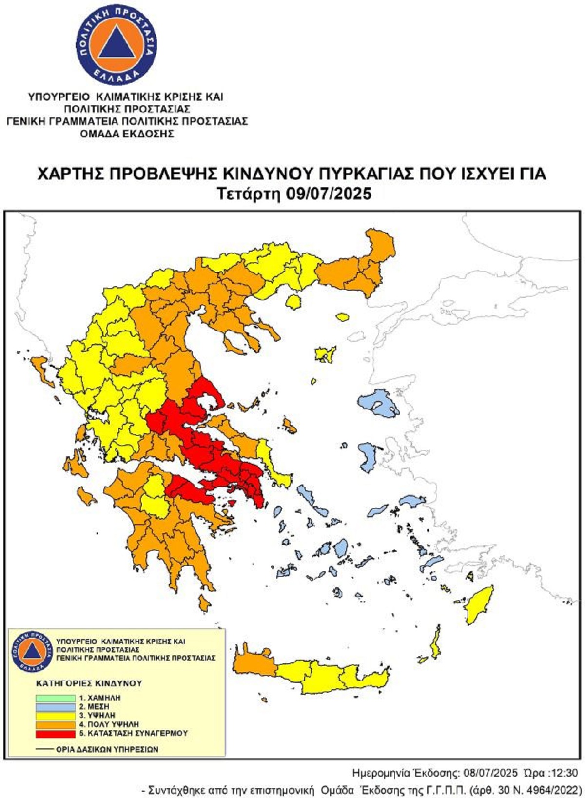 Εξαιρετικά σοβαρή χαρακτηρίζεται η Τετάρτη (9/7/25) σύμφωνα με τον επίσημο Χάρτη Πρόβλεψης Κινδύνου που δημοσιοποίησε η Γενική Γραμματεία Πολιτικής Προστασίας, αφού σε κατάσταση συναγερμού θα βρίσκονται πολλές περιοχές της χώρας, με κατηγορία κινδύνου 5, με ακραίες συνθήκες πυρκαγιάς.