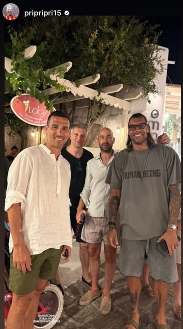 Η τετράδα των πρώην διεθνών μπασκετμπολίστων έκανε τουρ σε διάφορα κυκλαδίτικα νησιά, με στάσεις στη Σχοινούσα, την Ηρακλειά και καταλήγοντας το βράδυ στην Αντίπαρο με τον Βασίλη Σπανούλη να βγάζει μια selfie με τον άλλοτε συμπαίκτη και πολύ καλό του φίλο Γιώργο Πρίντεζη.