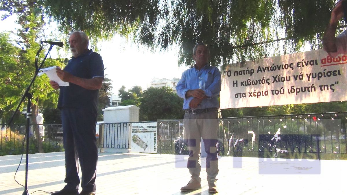 Παρών στη συγκέντρωση ο αδερφός του πατέρα Αντωνίου, ηγούμενος στη Νέα Μονή Χίου, πατέρας Διονύσιος Παπανικολάου, που μας μετέφερε τις ευχαριστίες του αδερφού του σε όλους και όλες που πίστεψαν και πιστεύουν στην αθωότητά του. Σε ότι αφορά την εξέλιξη της δίκης σημείωσε «με τη βοήθεια του Θεού, πιστεύουμε ότι πηγαίνει πολύ καλά, φτάνει αυτοί που δικάζουν να σταθούν στο ύψος τους».