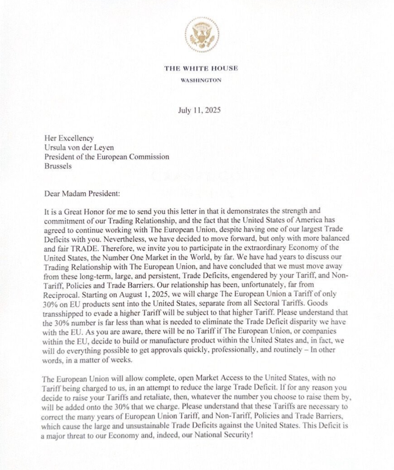 «Σημειώνουμε την επιστολή που έστειλε ο Πρόεδρος των ΗΠΑ Τραμπ, στην οποία περιγράφεται ένας αναθεωρημένος δασμολογικός συντελεστής και ένα νέο χρονοδιάγραμμα. Η επιβολή δασμών 30% στις εξαγωγές της ΕΕ θα διατάρασσε βασικές διατλαντικές αλυσίδες εφοδιασμού, εις βάρος των επιχειρήσεων, των καταναλωτών και των ασθενών και στις δύο πλευρές του Ατλαντικού. Λίγες οικονομίες στον κόσμο είναι ανοιχτές και τηρούν δίκαιες εμπορικές πρακτικές, στο επίπεδο της Ευρωπαϊκής Ένωσης. Η ΕΕ έχει δώσει σταθερά προτεραιότητα σε μια λύση κατόπιν διαπραγμάτευσης με τις ΗΠΑ, γεγονός που αντικατοπτρίζει τη δέσμευσή μας για διάλογο, σταθερότητα και μια εποικοδομητική διατλαντική εταιρική σχέση. Παραμένουμε έτοιμοι να συνεχίσουμε να εργαζόμαστε για μια συμφωνία έως την 1η Αυγούστου. Ταυτόχρονα, θα λάβουμε όλα τα απαραίτητα μέτρα για την προστασία των συμφερόντων της ΕΕ, συμπεριλαμβανομένης της υιοθέτησης αναλογικών αντιμέτρων, εάν χρειαστεί. Εν τω μεταξύ, συνεχίζουμε να εμβαθύνουμε τις παγκόσμιες συνεργασίες μας, βασισμένες σταθερά στις αρχές του διεθνούς εμπορίου που βασίζεται σε κανόνες».