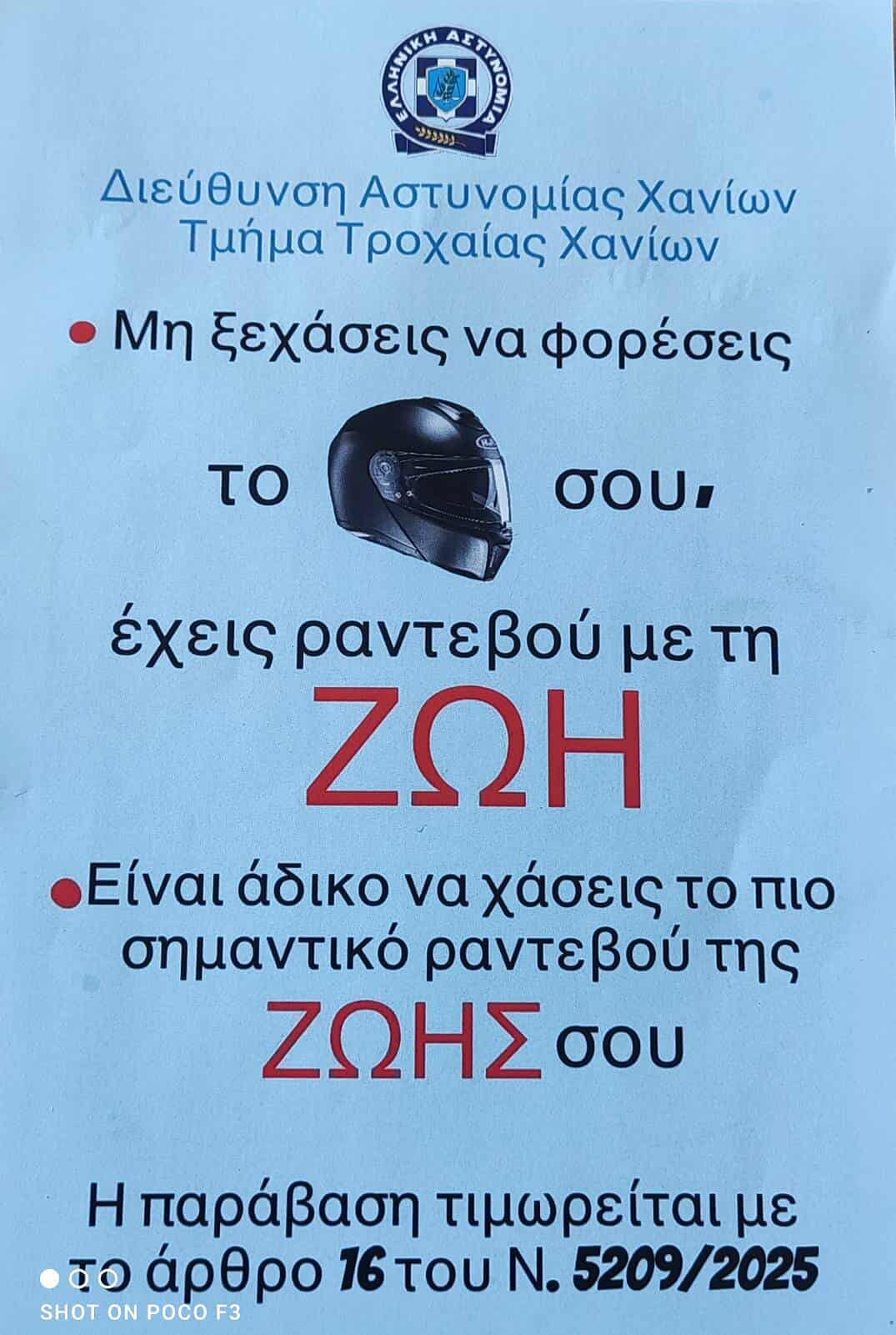 Στο πλαίσιο αυτό, η Διεύθυνση Αστυνομίας Χανίων σε συνεργασία με το Τμήμα Τροχαίας Χανίων διένειμε προστατευτικά κράνη και έντυπο συμβουλευτικό υλικό σε οδηγούς δικύκλων, σε μια προσπάθεια ενημέρωσης και ευαισθητοποίησης των πολιτών για την αναγκαιότητα χρήσης του, στοχεύοντας στην πρόληψη των τροχαίων ατυχημάτων και στην προστασία της ανθρώπινης ζωής.