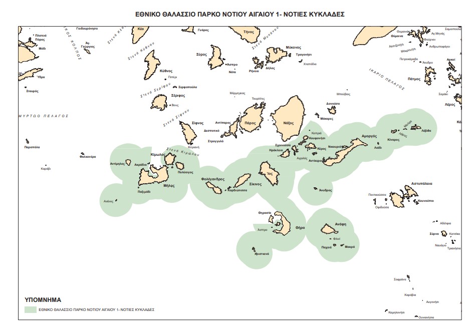 Ενώ στο Αιγαίο το πάρκο θα εκτείνεται από τη Μήλο, μέχρι την Αμοργό, συμπεριλαμβάνοντας την Αμοργό και νησίδες όπως η Άνυδρος και η Κίναρος και νοτίως θα ενσωματώνει τις θαλάσσιες περιοχές της Σαντορίνης και της Ανάφης με συνολική του έκταση 9.500 τετραγωνικά χιλιόμετρα.