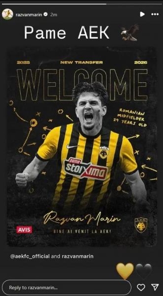 Λίγο μετά την ανακοίνωση της απόκτησής του από την ΑΕΚ, ο Ράζβαν Μάριν δημοσίευσε τη σχετική ανάρτηση της “κιτρινόμαυρης” ΠΑΕ και έγραψε “Πάμε ΑΕΚ”, δείχνοντας… ενημερωμένος για τη νέα του ομάδα.