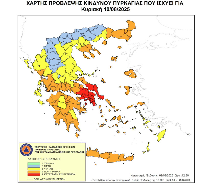 Ακραίος κίνδυνος πυρκαγιάς – Κατάσταση Συναγερμού (κατηγορία κινδύνου 5) για τις εξής περιοχές: