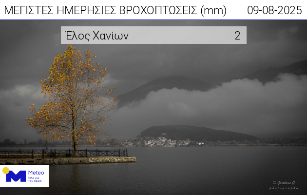Την ίδια ώρα, σε απόσταση λίγων χιλιομέτρων, στο Έλος Κισάμου, καταγράφτηκε η μοναδική βροχόπτωση της ημέρας σε όλη τη χώρα, μόλις δύο χιλιοστά.