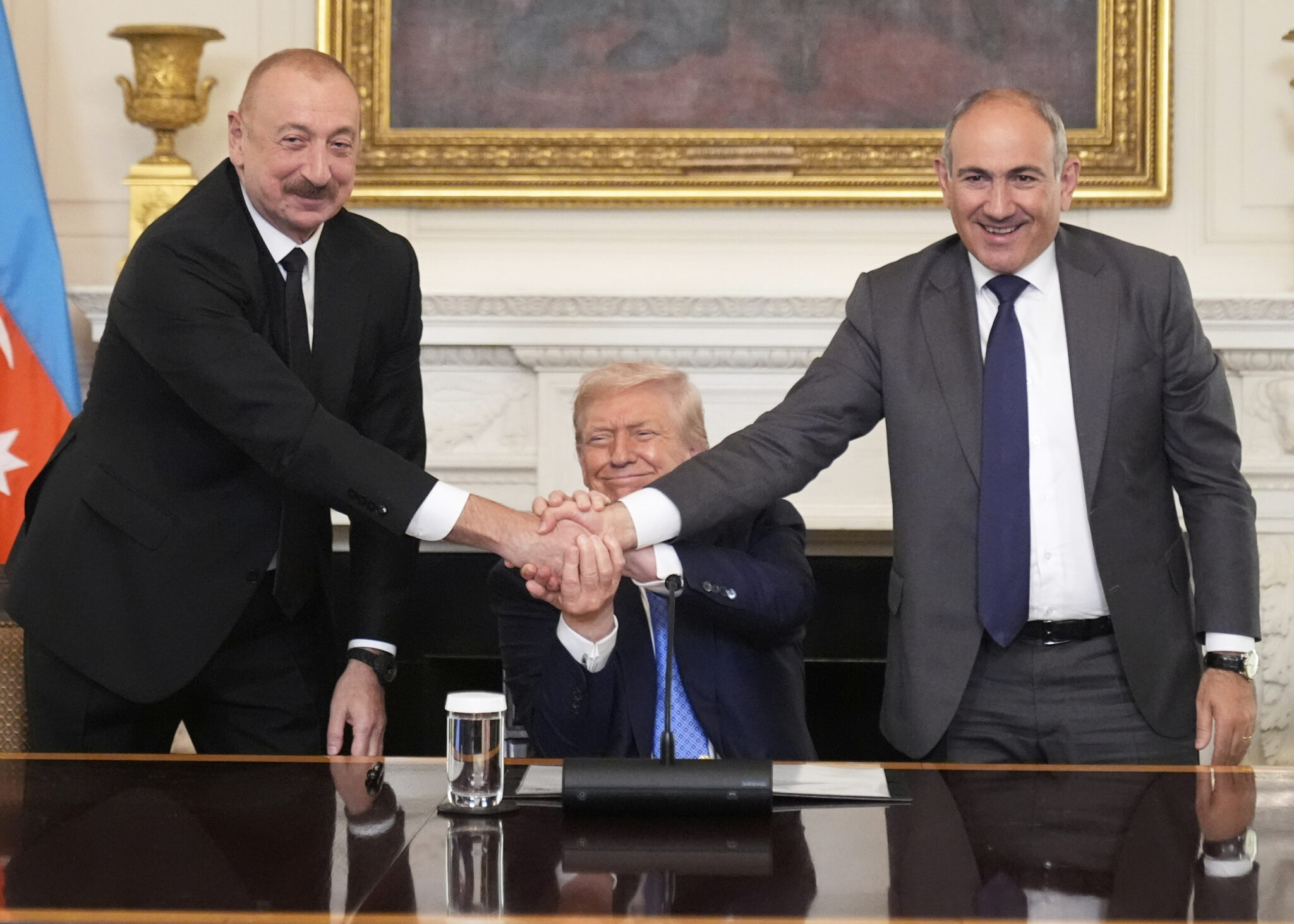 Οι ηγέτες του Αζερμπαϊτζάν και της Αρμενίας αντάλλαξαν χειραψία υπό το ικανοποιημένο βλέμμα του Τραμπ, πριν υπογράψουν και οι τρεις ένα έγγραφο, το οποίο ο Λευκός Οίκος χαρακτήρισε «κοινή δήλωση».