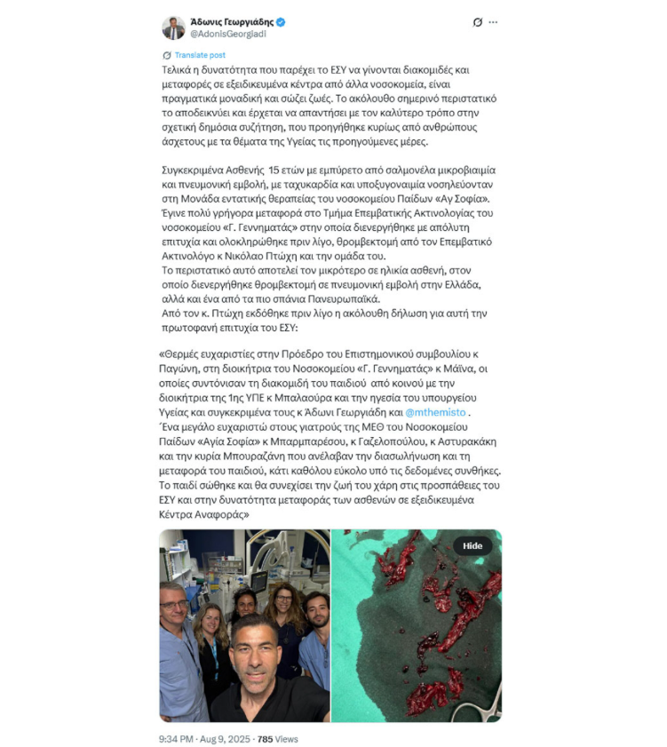 Όπως αναφέρει σε ανάρτησή του στο Χ ο κ. Γεωργιάδης, η 15χρονη «αποτελεί τον μικρότερο σε ηλικία ασθενή, στον οποίο διενεργήθηκε θρομβεκτομή σε πνευμονική εμβολή στην Ελλάδα, αλλά και ένα από τα πιο σπάνια Πανευρωπαϊκά».