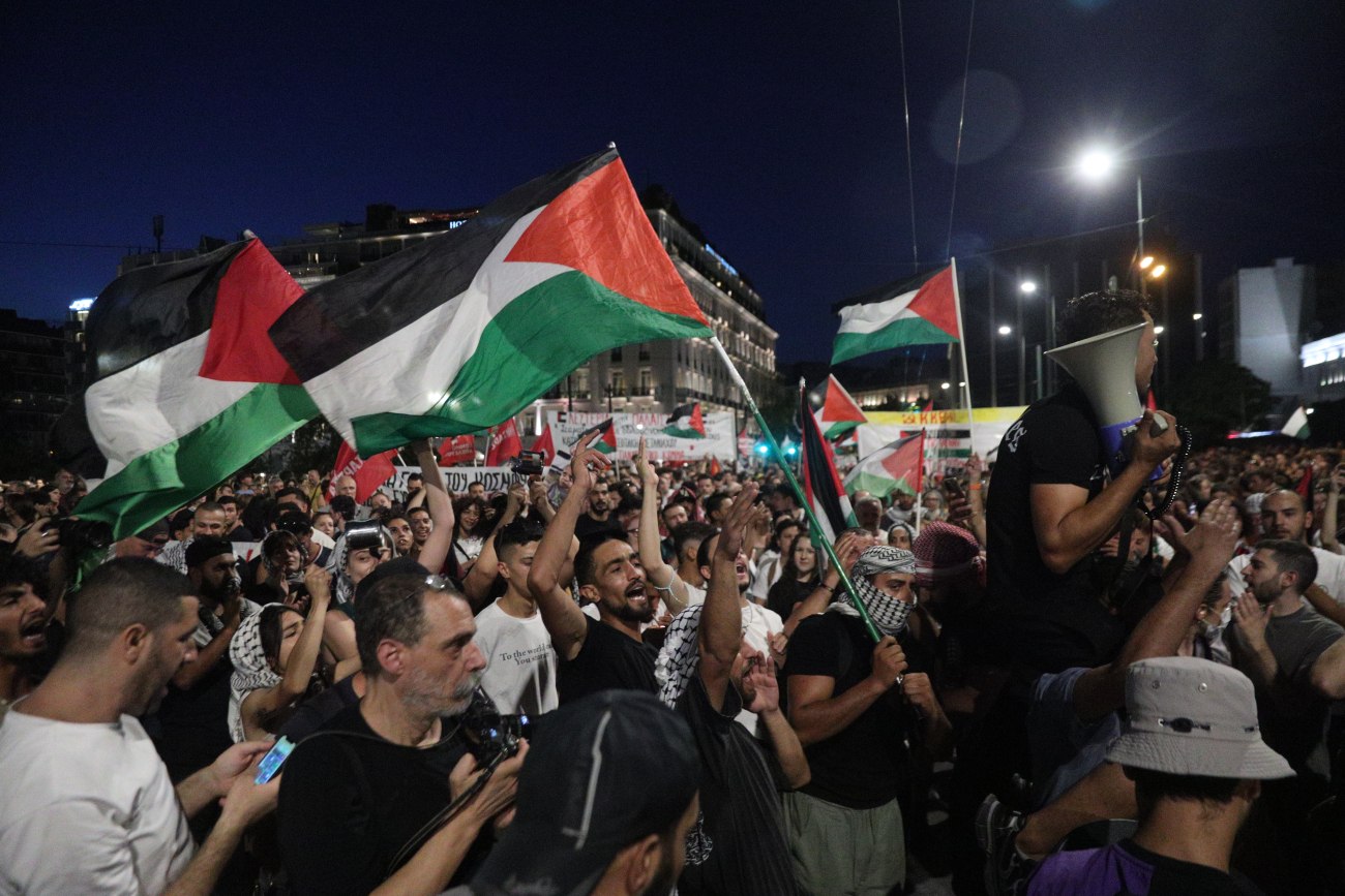 Στο Σύνταγμα χιλιάδες πολίτες συγκεντρώθηκαν φωνάζοντας συνθήματα υπέρ της Παλαιστίνης.