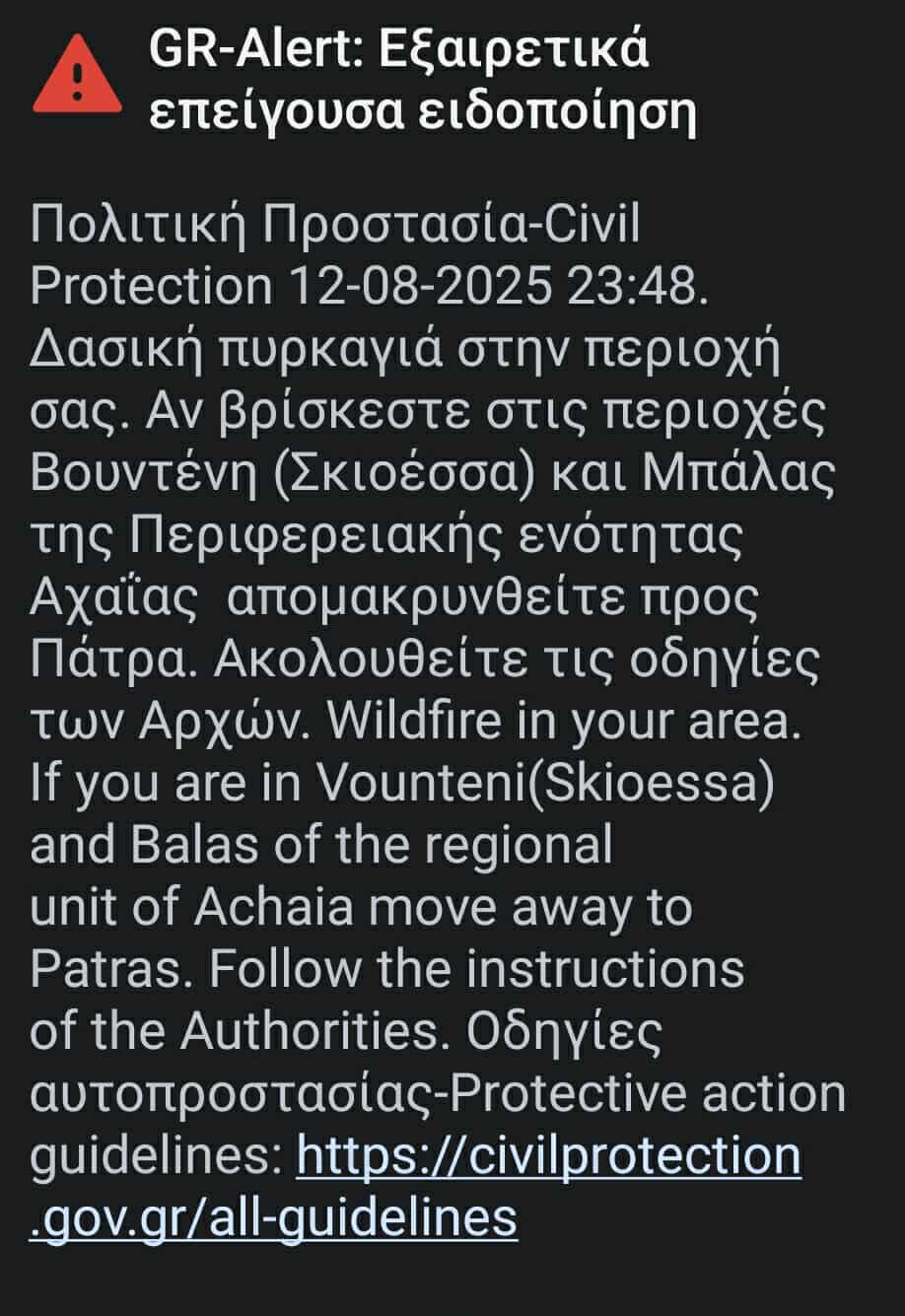 Ακολούθησε μήνυμα από το “112” για την εκκένωση των περιοχών Βουντένη (Σκιοέσσα) και Μπάλας προς Πάτρα.