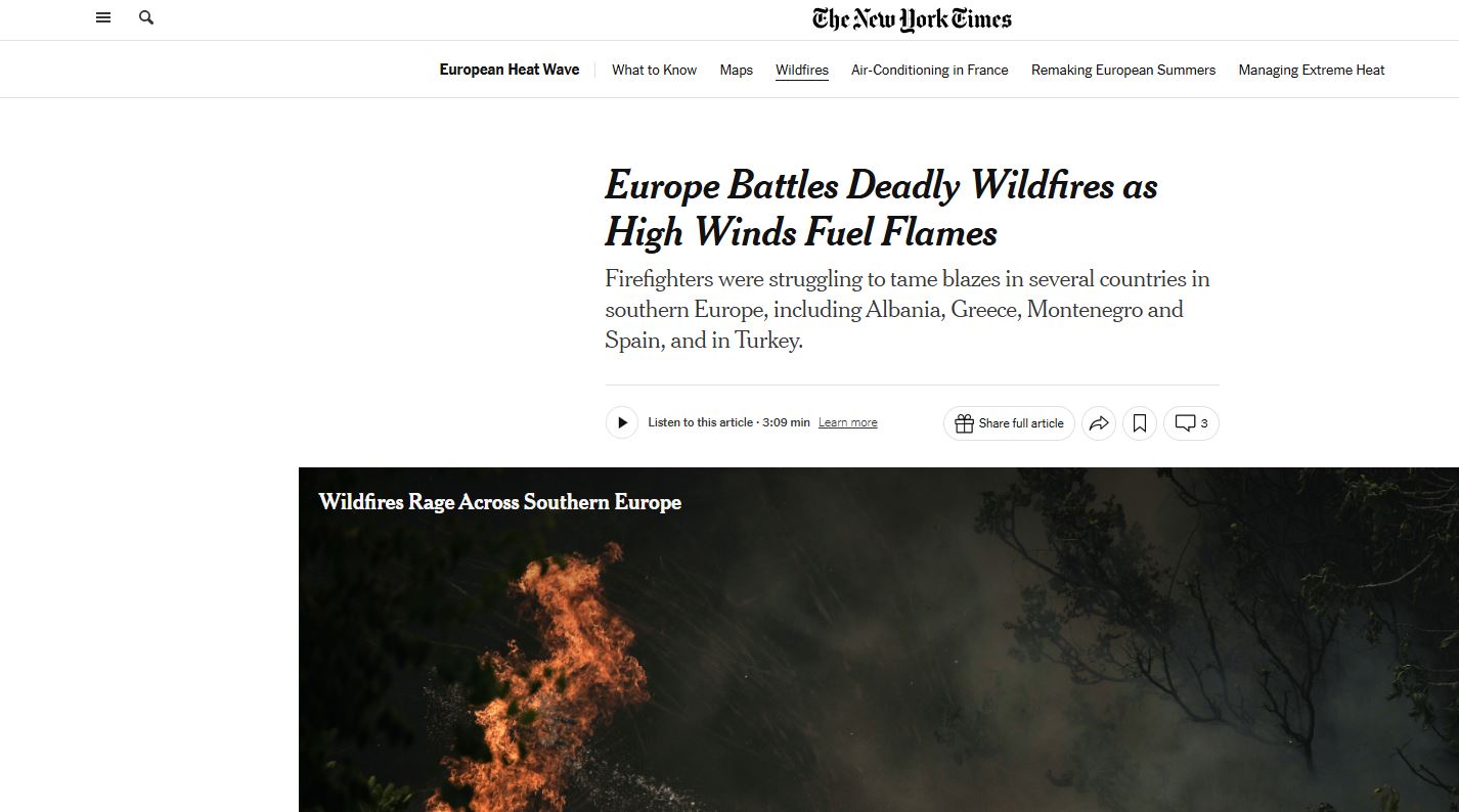Όπως υπογραμμίζουν οι NYT, από την Παρασκευή, ακραίες θερμοκρασίες έχουν πλήξει μεγάλο μέρος της νότιας Ευρώπης, τροφοδοτώντας πυρκαγιές που έχουν στοιχίσει τη ζωή σε τουλάχιστον έξι ανθρώπους στις πυρκαγιές που μαίνονται και σήμερα Τετάρτη, σε Ισπανία, Ελλάδα, Τουρκία, Μαυροβούνιο και Αλβανία. Δεκάδες άνθρωποι, μεταξύ των οποίων και πυροσβέστες, έχουν τραυματιστεί.