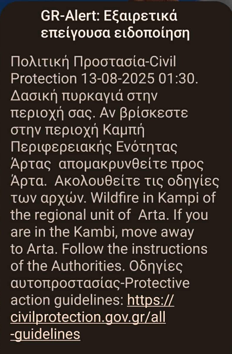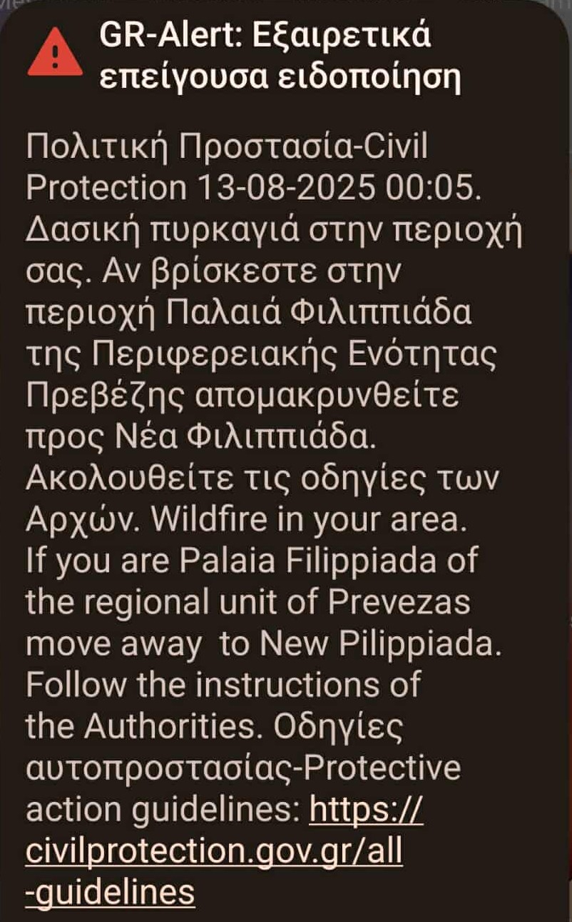 Πέντε λεπτά μετά τα μεσάνυχτα νέο μήνυμα από το “112” κάλεσε όσους βρίσκονται στην Παλαιά Φιλιππιάδα να απομακρυνθούν προς τη Νέα Φιλιππιάδα.