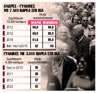 Παράλληλα, μειωμένη σύνταξη από το Δημόσιο πριν από τα 62 ισχύει για όσους διορίστηκαν πριν από το 1993 και συμπλήρωσαν τις ηλικίες των 55, 56, 58 και 60 ετών ως το 2022, με 25ετία στα έτη 2010, 2011 και 2012.