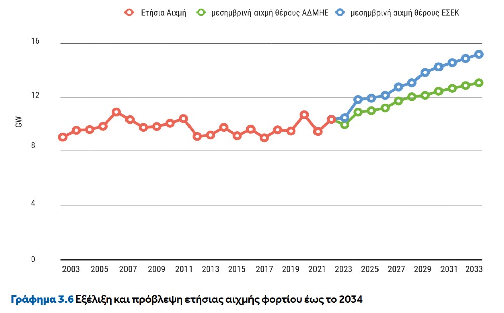 Μάλιστα, ο ΑΔΜΗΕ εκτιμά ότι η αιχμή της ζήτησης θα βρεθεί κοντά στα 13.000 MW το 2034.