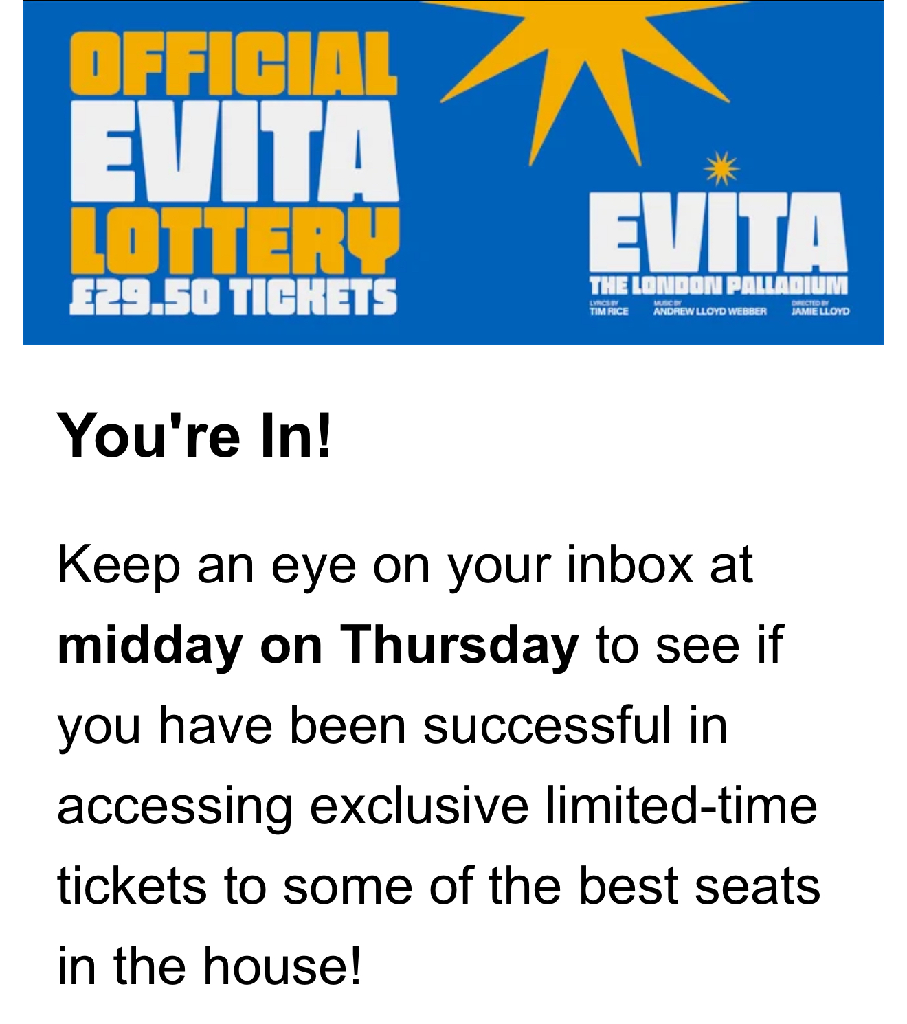 Η Εβίτα στο Λονδίνο είναι πλέον κάτι σαν θεατρικό Ολυμπιακό μετάλλιο: δύσκολο να το κερδίσεις, αλλά η χαρά είναι απίστευτη μόλις το πάρεις στα χέρια σου. (Στην κριτική μας που θα αναρτηθεί σε λίγο, θα δεις αν το ίδιο ισχύει μόλις δεις την παράσταση). Με λίγη υπομονή, γρήγορα αντανακλαστικά και ίσως μια δόση θράσους, μπορείς να δεις το σόου χωρίς να μπεις στη λίστα των μεγαλοοφειλετών της εφορίας. Κι αν τελικά δεν βρεις εισιτήριο; Πήγαινε κάτω από το μπαλκόνι. Η Εβίτα θα σου τραγουδήσει δωρεάν. Κι εσύ… μπορεί να τραγουδήσεις μαζί της χωρίς να κρίνει το πόπολο τα φάλτσα σου.