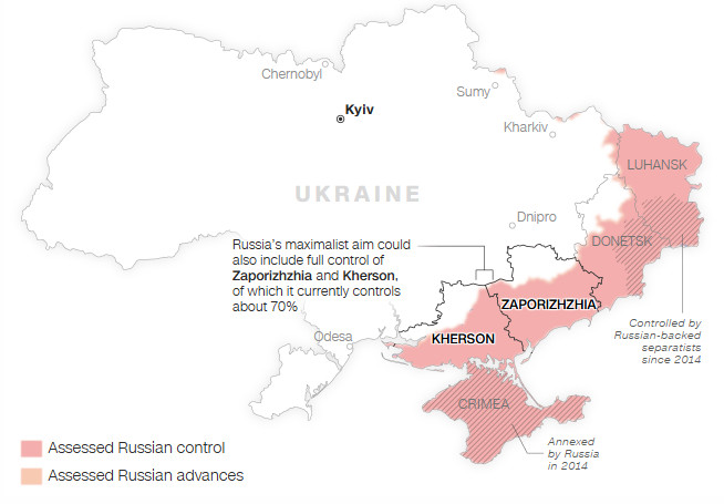 Η Μόσχα ελέγχει το μεγαλύτερο μέρος του Ντονέτσκ και σχεδόν ολόκληρο το Λουχάνσκ. Ωστόσο, διατηρεί μόνο τα δύο τρίτα των περιφερειών Χερσώνας και Ζαπορίζια, οι οποίες απελευθερώθηκαν μερικώς από τις ουκρανικές δυνάμεις στα τέλη του 2022.