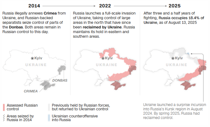 Ο Πρόεδρος των ΗΠΑ, Ντόναλντ Τραμπ, και ο Ρώσος ηγέτης, Βλαντίμιρ Πούτιν, συναντώνται την Παρασκευή σε μια σύνοδο κορυφής στην Αλάσκα, με στόχο —τουλάχιστον από την πλευρά των ΗΠΑ— τον τερματισμό του αιματηρού πολέμου που ακολούθησε την πλήρους κλίμακας εισβολή της Ρωσίας το 2022. Οποιαδήποτε ειρηνευτική συμφωνία για την Ουκρανία θα πρέπει να περιλαμβάνει συμφωνία για τα εδάφη, καθώς η Ρωσία κατέχει σήμερα σχεδόν το ένα πέμπτο της ουκρανικής επικράτειας.