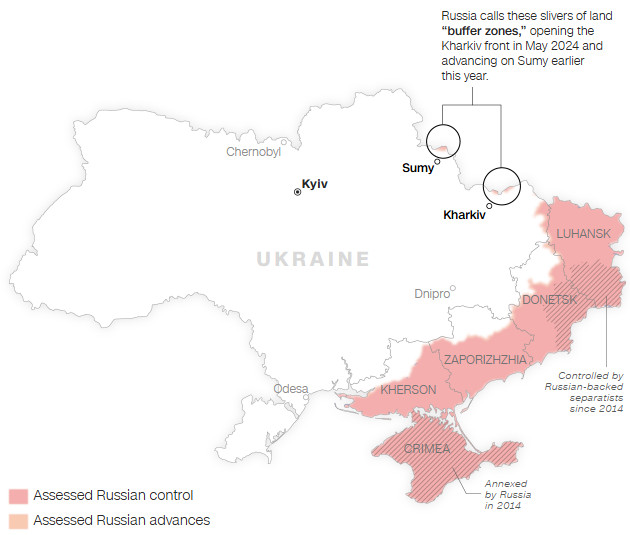 Δεν υπάρχουν εύκολες επιλογές για παραχωρήσεις από την πλευρά της Ρωσίας. Κατέχει εδάφη στα βόρεια σύνορα — κοντά στο Σούμι και στο Χάρκιβ — που το Κρεμλίνο αποκαλεί «ζώνες ασφαλείας», αποτέλεσμα αποτυχημένων επιθέσεων για να εξαντληθούν οι ουκρανικές δυνάμεις. Ωστόσο, πρόκειται για μικρές περιοχές και, όπως υπενθυμίζουν Ουκρανοί αξιωματούχοι, είναι επίσης ουκρανικό έδαφος — όχι ρωσικό. Δεν αποτελούν, επομένως, ουσιαστική ή ισότιμη «ανταλλαγή».
