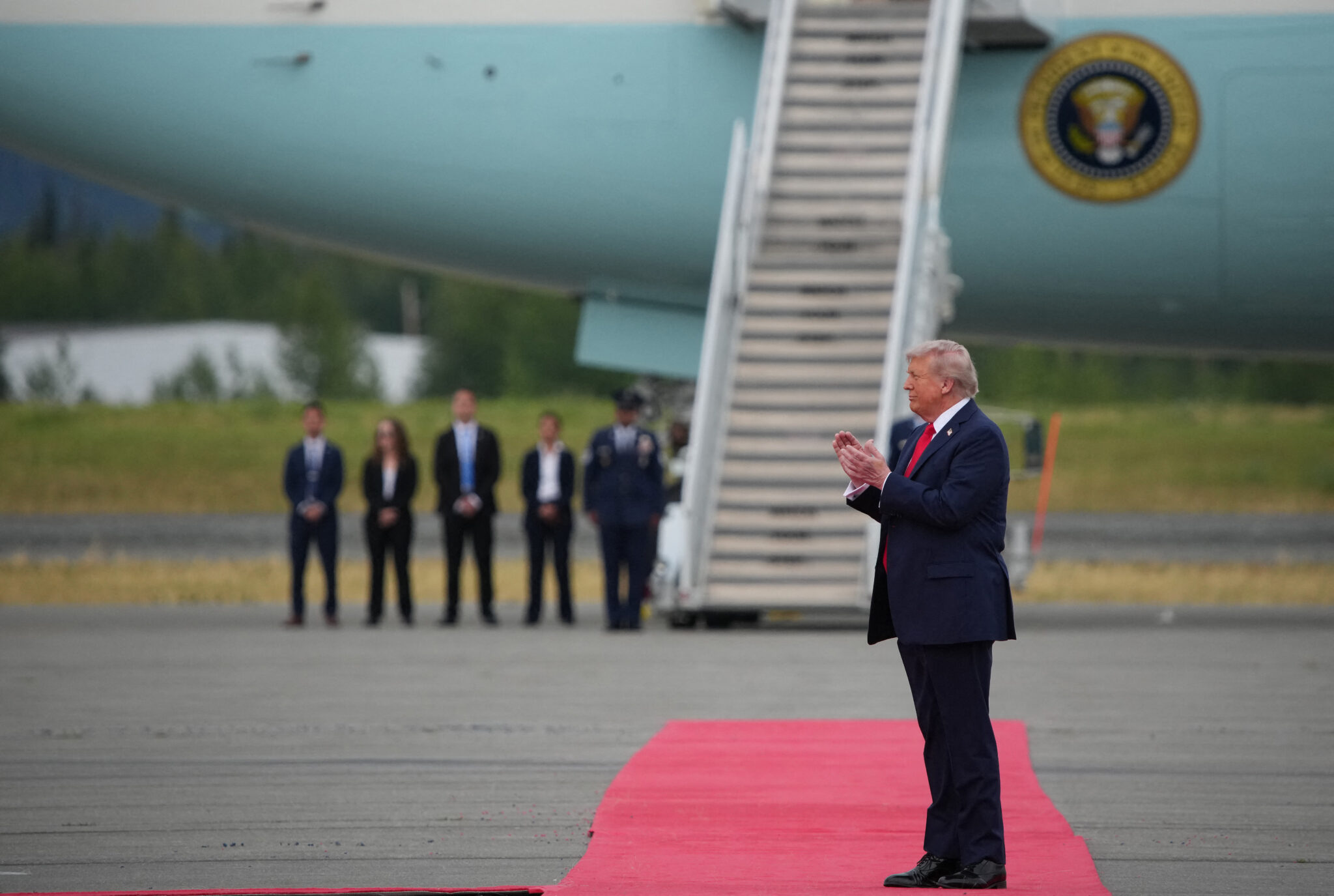Θερμή υποδοχή από τον Αμερικανό πρόεδρο ο οποίος σταμάτησε και, καθώς ο Πούτιν πλησίαζε, χειροκρότησε τον Ρώσο ηγέτη ενώ του έδωσε μια θερμή χειραψία και του έριξε ένα φιλικό χτύπημα στον ώμο. Ο Πούτιν φάνηκε να κάνει ένα αστείο και οι δύο άνδρες χαμογέλασαν.