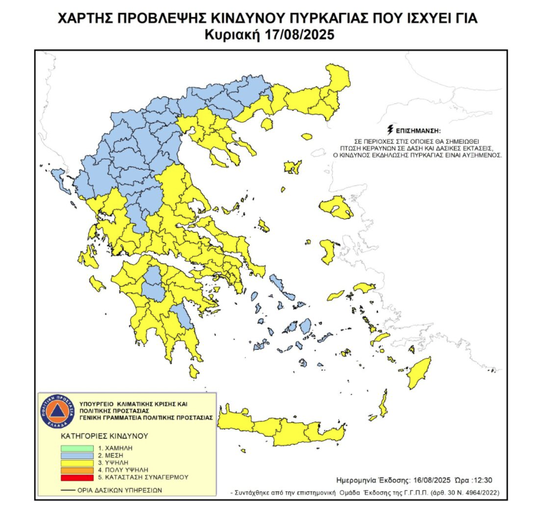 Ο Χάρτης Επικινδυνότητας που εκδίδει η Γενική Γραμματεία Πολιτικής Προστασίας του Υπουργείου Κλιματικής Κρίσης & Πολιτικής Προστασίας προβλέπει για την Κυριακή (17/8) ότι θα υπάρχει υψηλός κίνδυνος πυρκαγιάς σε αρκετές περιοχές της χώρας.