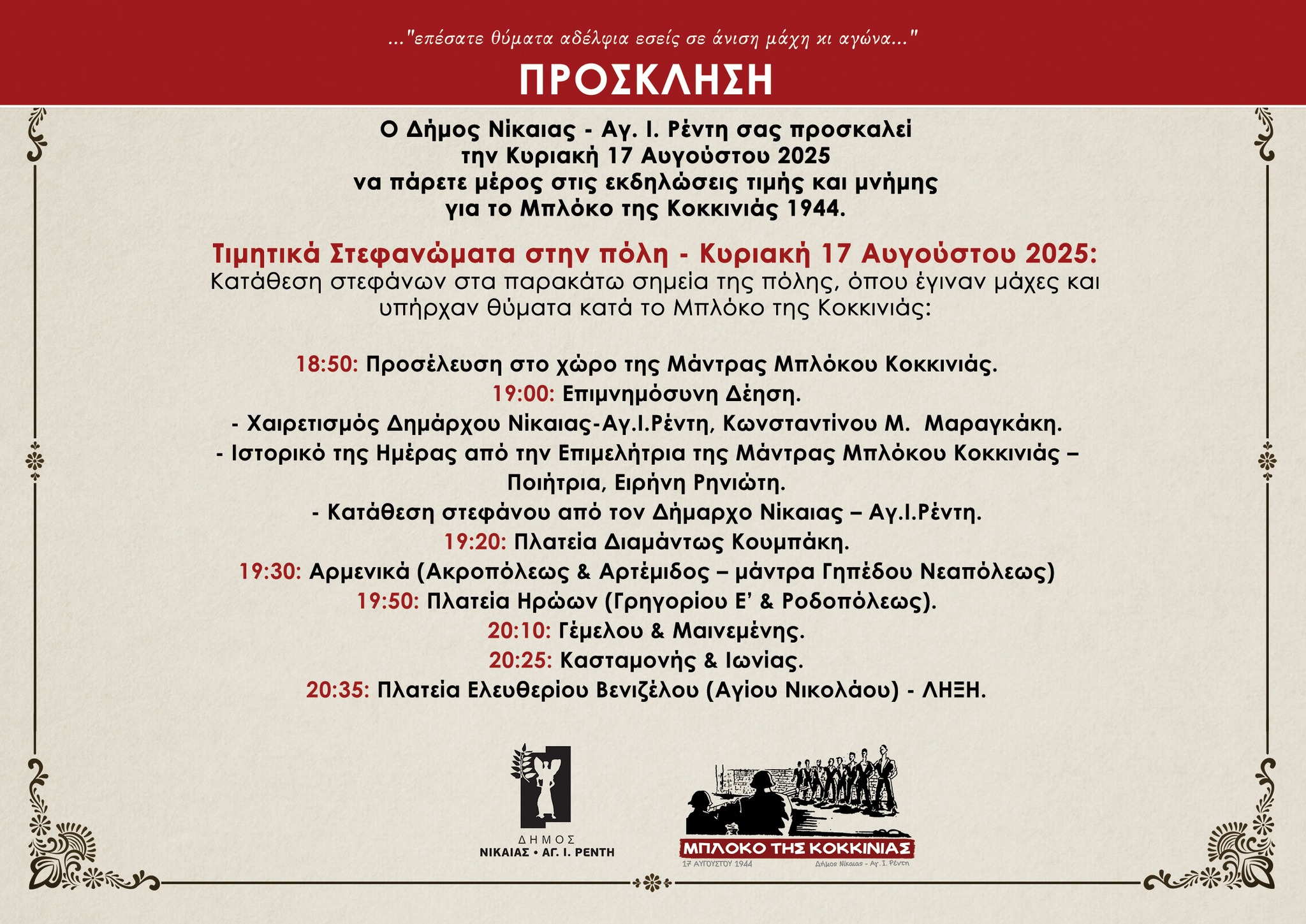 Ο Δήμος Νίκαιας – Αγ.Ι.Ρέντη σας προσκαλεί στην εκδήλωση τιμής και μνήμης για τους Εκτελεσμένους του Μαρτυρικού Μπλόκου της Κοκκινιάς – 17η Αυγούστου 1944.