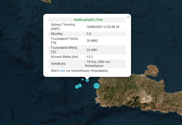 Σύμφωνα με το Γεωδυναμικό Ινστιτούτο Αθηνών, νωρίτερα το μεσημέρι (15:02) σημειώθηκε στον νομό Χανίων σεισμική δόνηση μεγέθους 3,8 Ρίχτερ. Το επίκεντρο του σεισμού εντοπίστηκε 14 χιλιόμετρα ΔΝΔ των Φαλασάρνων, ενώ το εστιακό βάθος υπολογίστηκε στα 13,3 χιλιόμετρα.