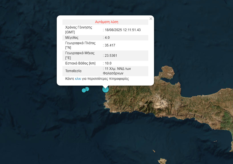 Σεισμός 4 Ρίχτερ σημειώθηκε στην Κρήτη. Σύμφωνα με την αυτόματη λύση του Γεωδυναμικού σημειώθηκε 11 χιλιόμετρα ΝΝΔ των Φαλασάρνων σε εστιακό βάθος 10 χιλιομέτρων.