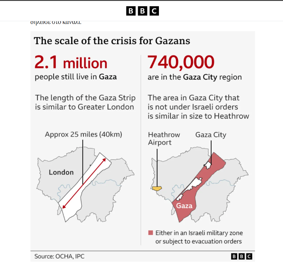 Εκατοντάδες χιλιάδες Παλαιστίνιοι στην πόλη της Γάζας αναμένεται να λάβουν εντολή να εκκενώσουν την περιοχή και να κατευθυνθούν σε καταφύγια στη νότια Γάζα. Από τα 2 εκατομμύρια Παλαιστινίων, οι 740.000 βρίσκονται στην πόλη της Γάζας, εδάφη εκτός ισραηλινού ελέγχου, που σε έκταση είναι όσο το αεροδρόμιο Χίθροου, σύμφωνα με το BBC.