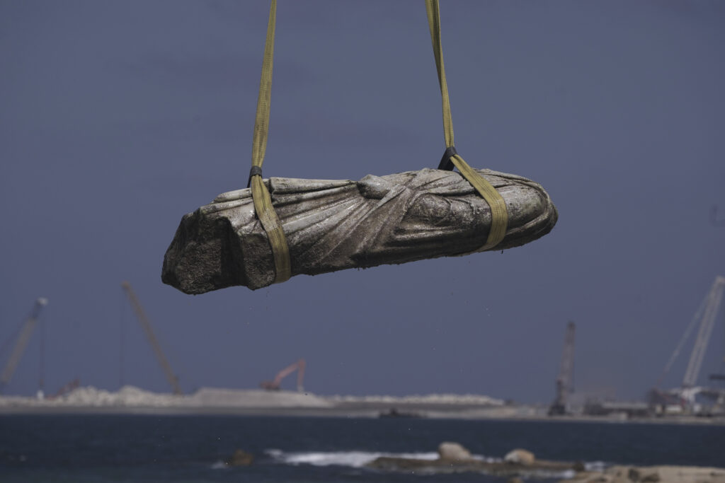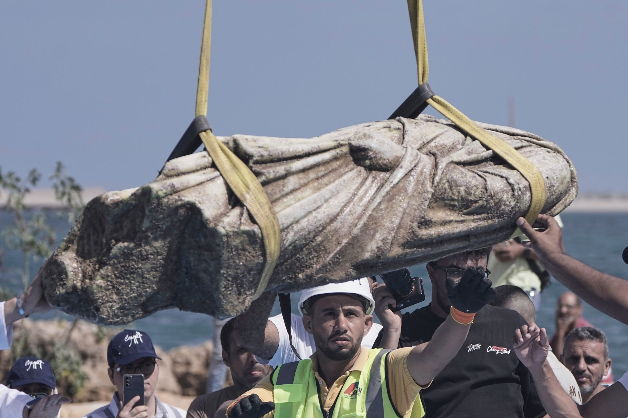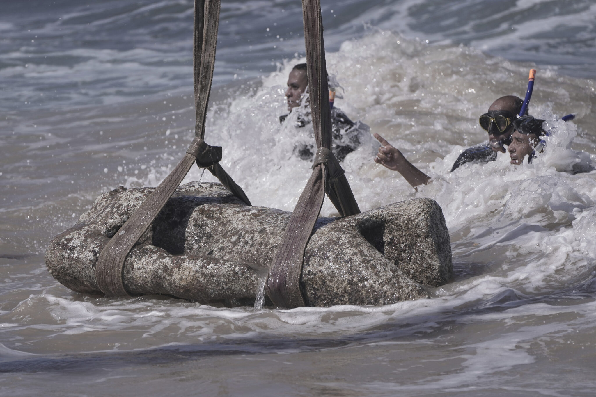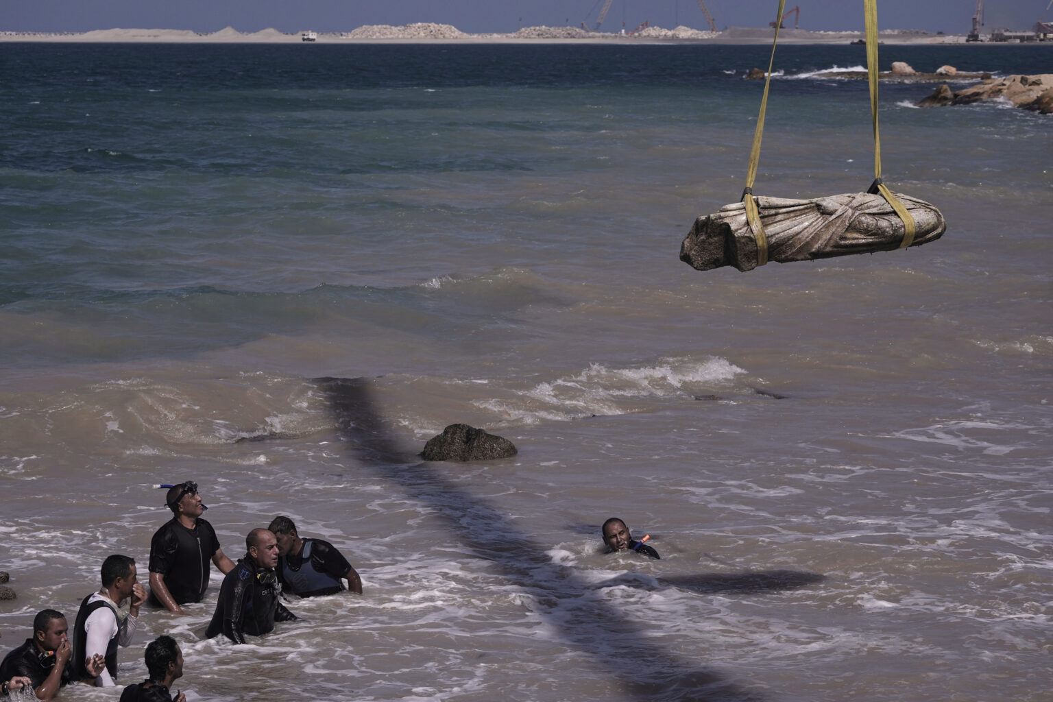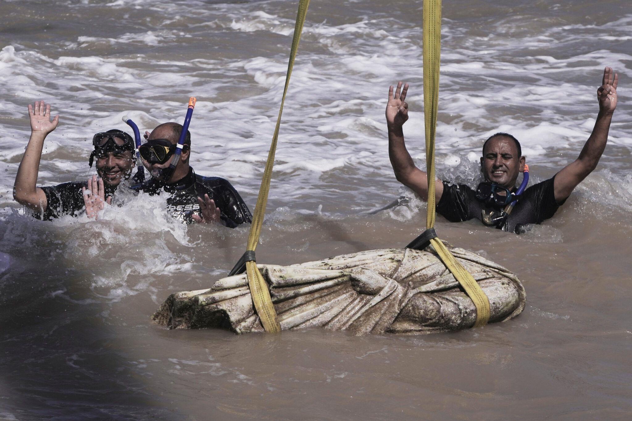 Την Πέμπτη, γερανοί ανέσυραν αργά τα αγάλματα από τα βάθη, ενώ δύτες με στολές, που είχαν βοηθήσει στην ανάσυρσή τους, επευφημούσαν από την ακτή.