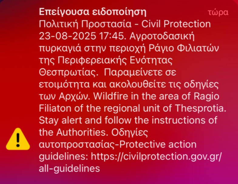 Φωτιά ξέσπασε σε δασική έκταση το απόγευμα του Σαββάτου (23.08.2025) στη Θεσπρωτία στην περιοχή Ράγιο. Στάλθηκε μήνυμα από το 112 στα κινητά των κατοίκων να παραμένουν σε ετοιμότητα.