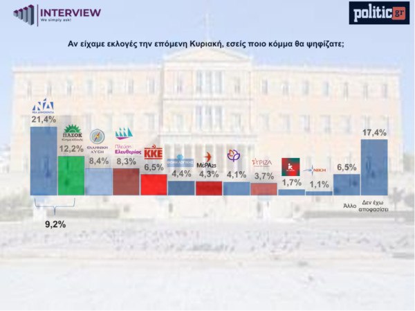 Συνεχίζεται η κυβερνητική και πρωθυπουργική φθορά, όπως καταγράφει η πρώτη δημοσκόπηση μετά το καλοκαιρινό διάλειμμα, με τη Νέα Δημοκρατία να υποχωρεί σχεδόν πέντε μονάδες σε σχέση με τον Ιούνιο, σύμφωνα με την εταιρεία Interview για το Politic. Παρά την πτώση, η ΝΔ παραμένει πρώτη με ποσοστό 21,4%, ενώ το ΠΑΣΟΚΚΙΝΑΛ ακολουθεί με 12,2%. Εντύπωση προκαλεί η τρίτη θέση της Ελληνικής Λύσης με 8,4%, κοντά στην Πλεύση Ελευθερίας 8,3%.