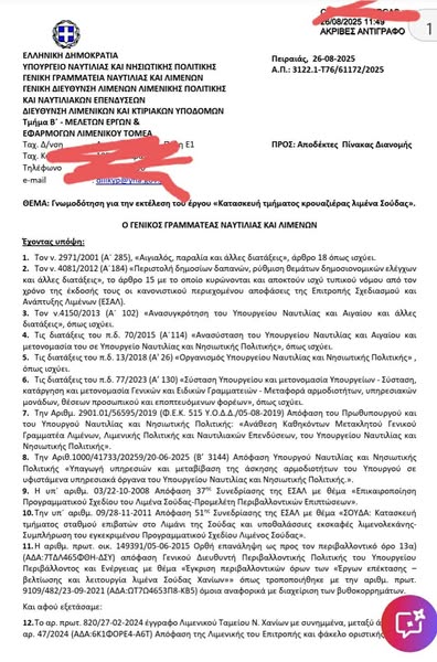Δημοσιεύτηκε σήμερα η θετική γνωμοδότηση του Υπουργείου Ναυτιλίας για την «Κατασκευή Τμήματος κρουαζιέρας του λιμένα Σούδας», ουσιαστικά για την επέκταση της προβλήτα Αδρίας κατά 160 μέτρα. Το έργο -προϋπολογισμού 25 εκ. ευρώ- από πλευράς μελετών είναι πλέον πλήρως  ολοκληρωμένο και ΩΡΙΜΟ, έχει προϋπολογισμό  περίπου 25 εκατομμύρια ευρώ, ενώ ξεκινά άμεση η αναζήτηση πόρων για τη χρηματοδότησή του.