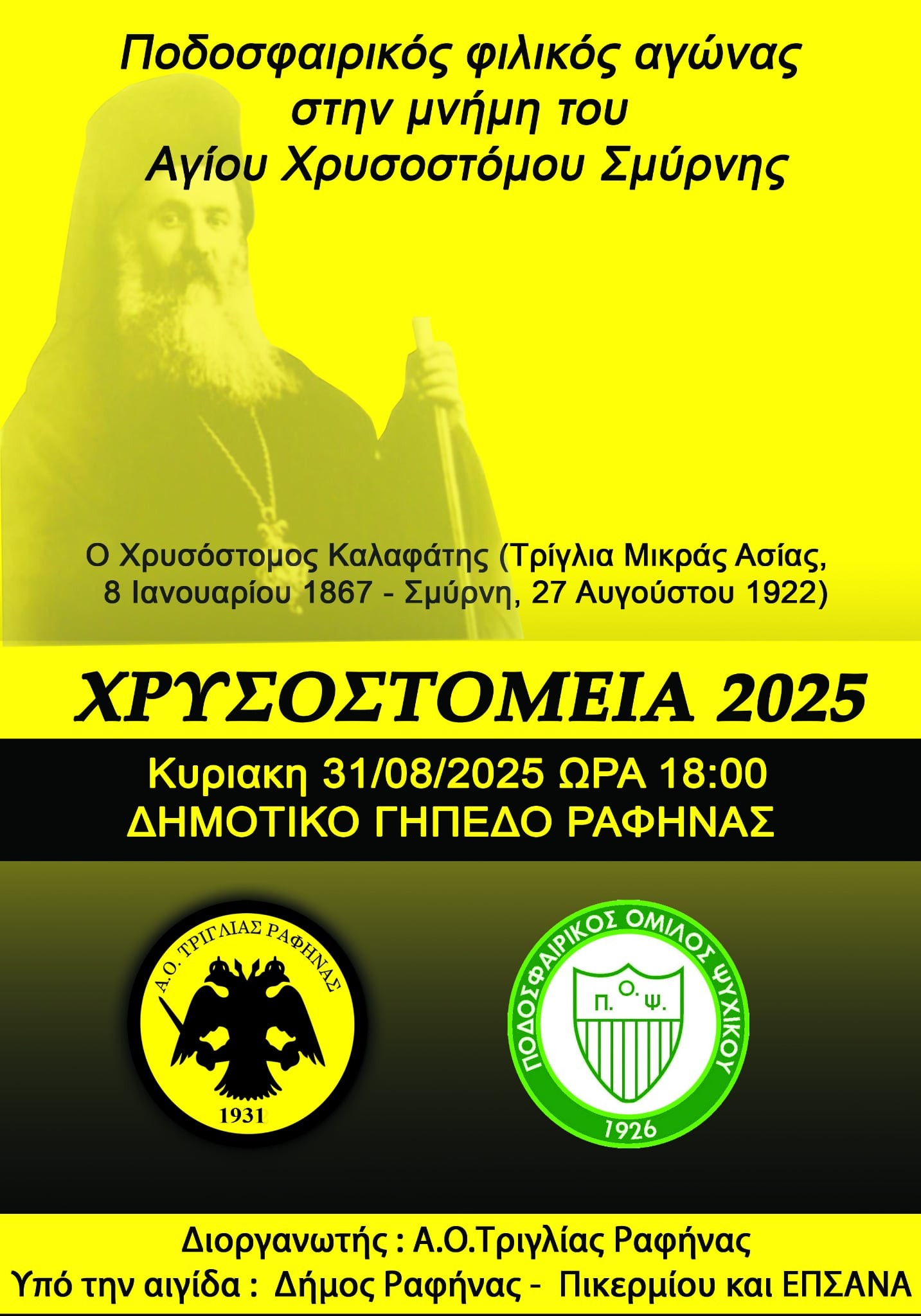 Σήμερα Κυριακή 31 Αυγούστου στο δημοτικό γήπεδο της Ραφήνας, για άλλη μία χρονιά θα διεξαχθούν τα «Χρυσοστόμεια», που όπως τονίζει ο Α.Ο. Τριγλίας Ραφήνας, που μαζί με την ΕΠΣΑΝΑ και το Δήμο Ραφήνας-Πικερμίου, είναι οι οικοδεσπότες: «Κάθε χρόνο τα “ΧΡΥΣΟΣΤΟΜΕΙΑ” αποτελούν ένα σημαντικό γεγονός για την πόλη της Ραφήνας. Ένα γεγονός αθλητικό, κοινωνικό, πολιτιστικό.