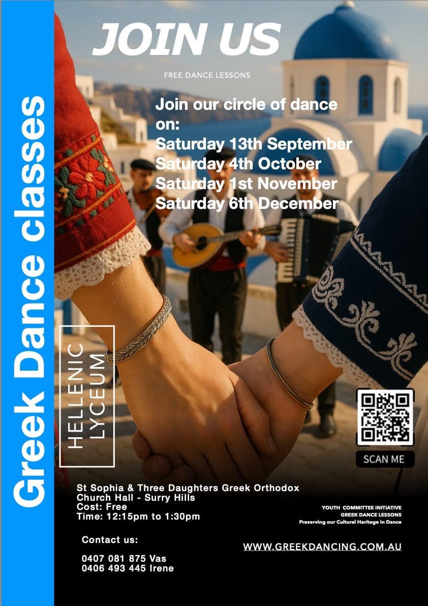 Δωρεάν μαθήματα ελληνικών παραδοσιακών χορών οργανώνει σε επιλεγμένες ημερομηνίες το Λύκειο Ελληνίδων Σίδνεϋ  προκειμένου να μεταδώσει την κληρονομιά της Ελλάδας σε ομογενείς και μη κατοίκους της αυστραλιανής μεγαλούπολης.