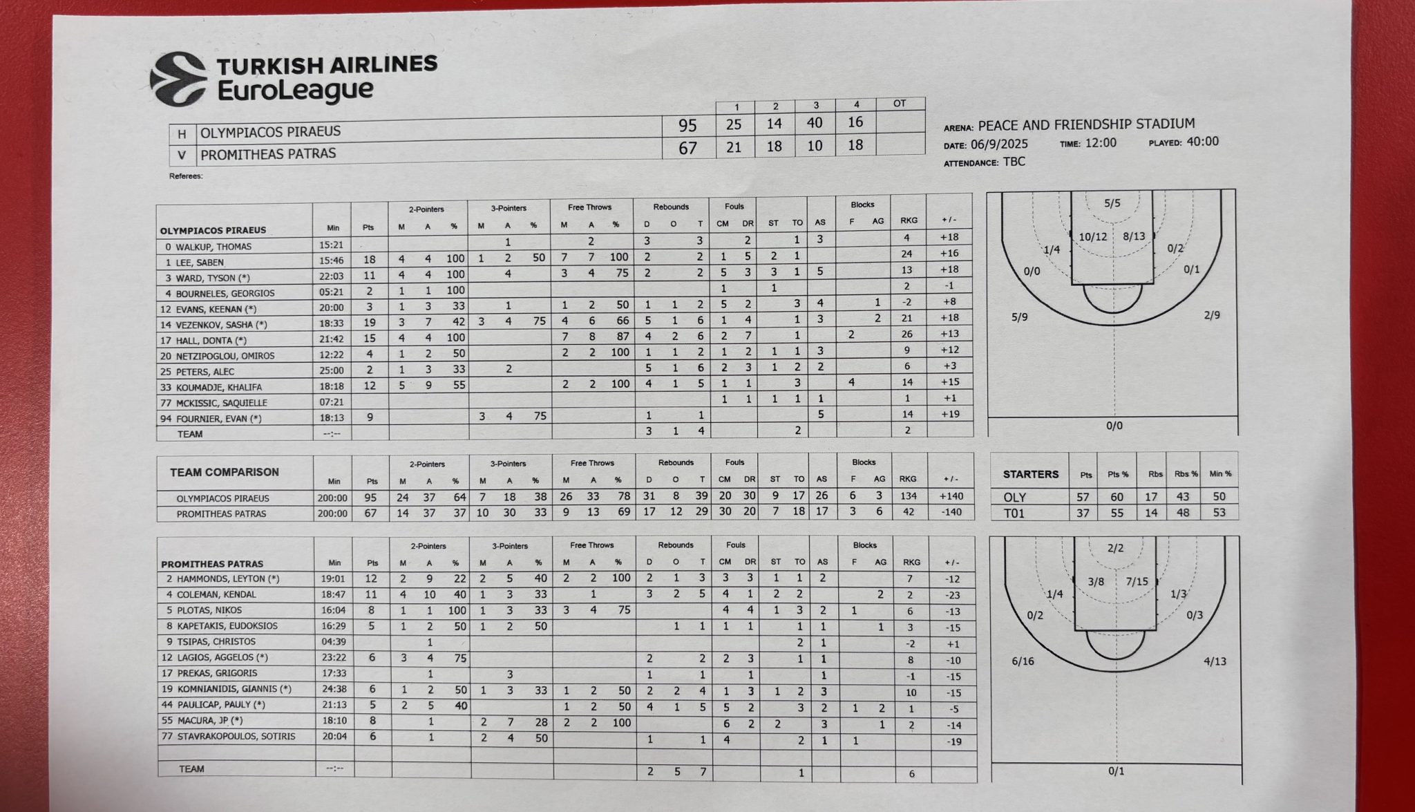 Αναλυτικά τα στατιστικά του φιλικού Ολυμπιακός – Προμηθέας Πάτρας 95-67
