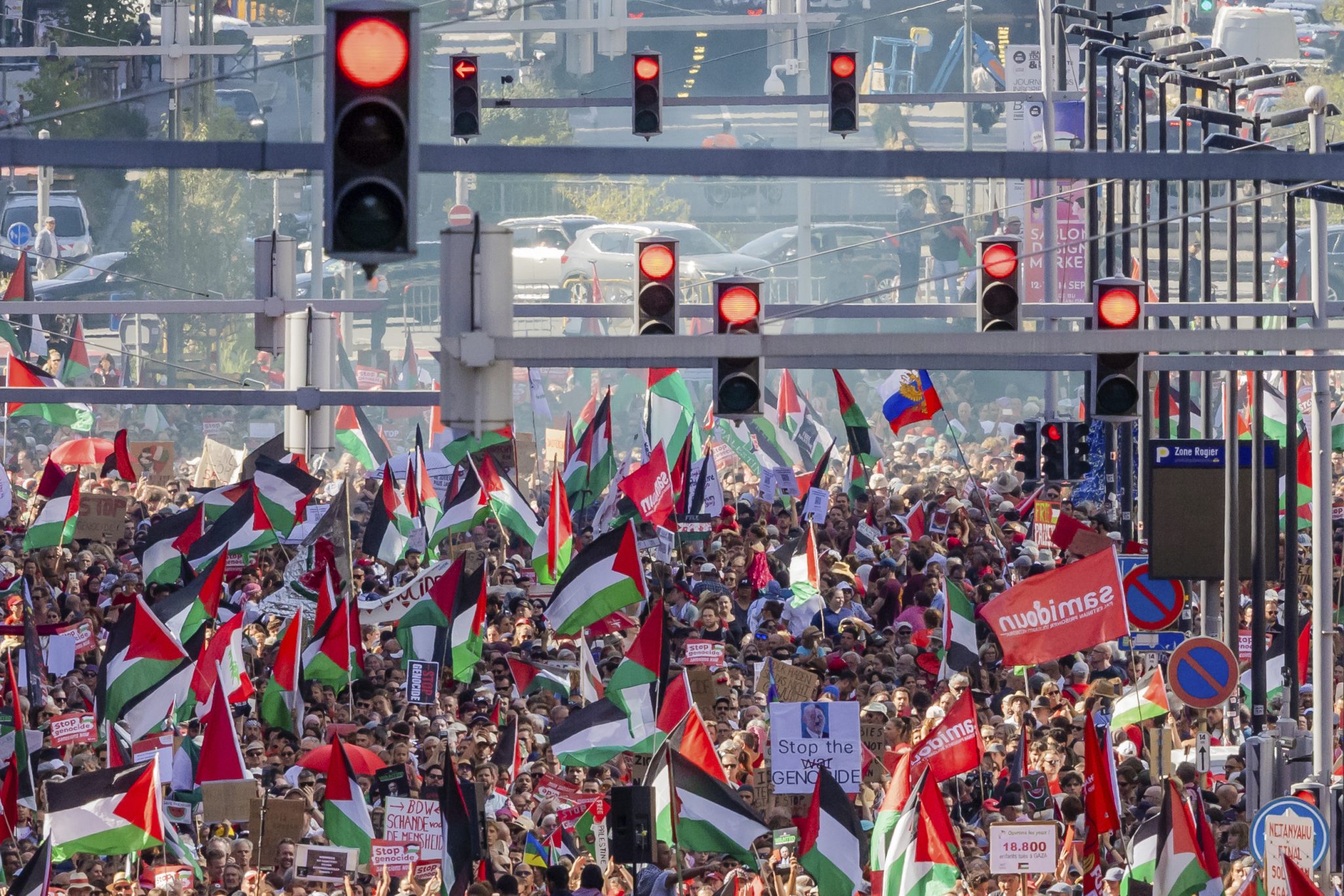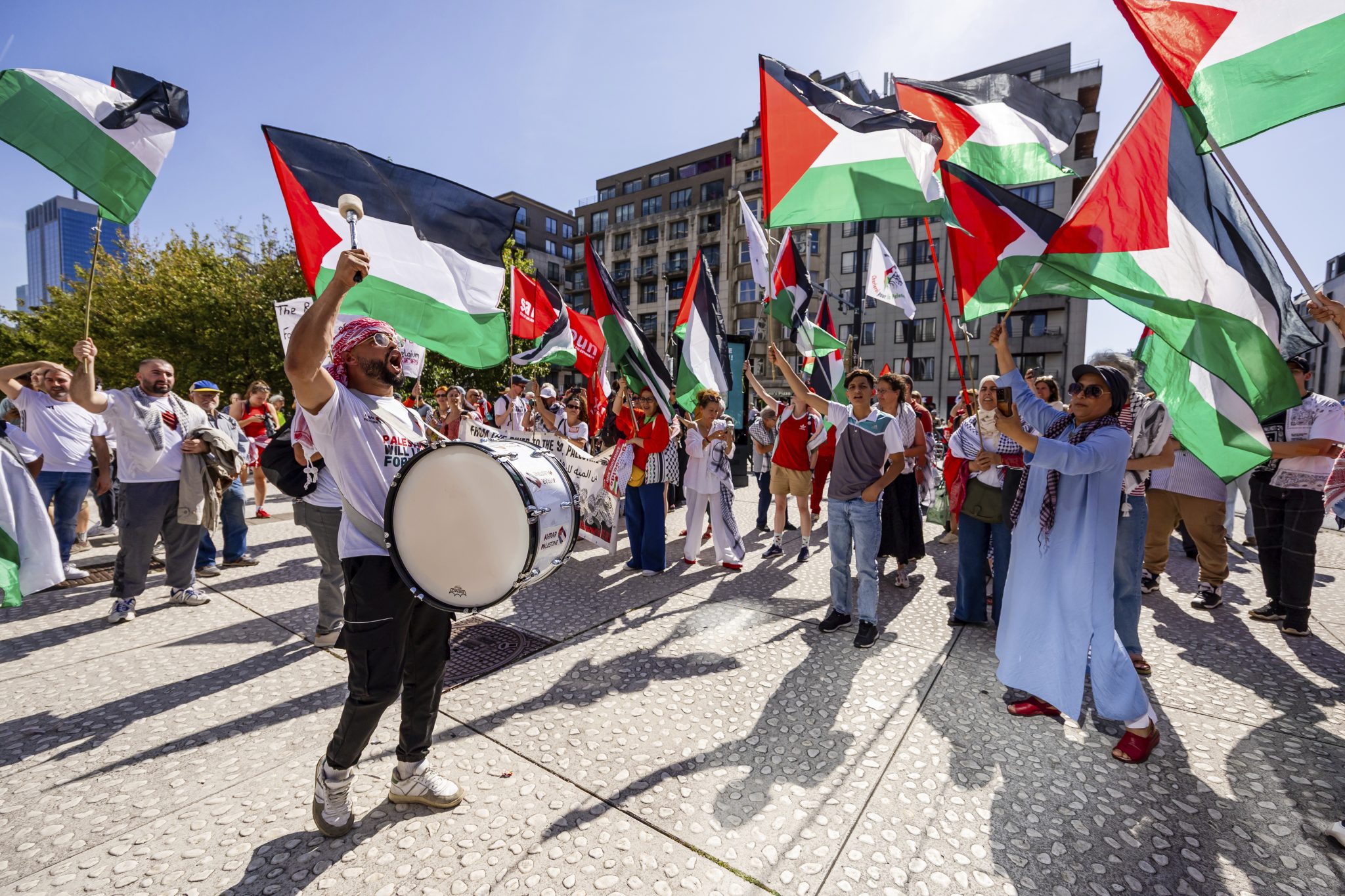 Δεκάδες χιλιάδες άνθρωποι -70.000 σύμφωνα με την αστυνομία, 120.000 σύμφωνα με τους οργανωτές- διαδήλωσαν σήμερα στις Βρυξέλλες, εκφράζοντας την αλληλεγγύη τους στους Παλαιστίνιους.