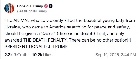 Μάλιστα ο πρόεδρος Ντόναλντ Τραμπ αντέδρασε με οργισμένη ανάρτηση μετά τη δολοφονία.