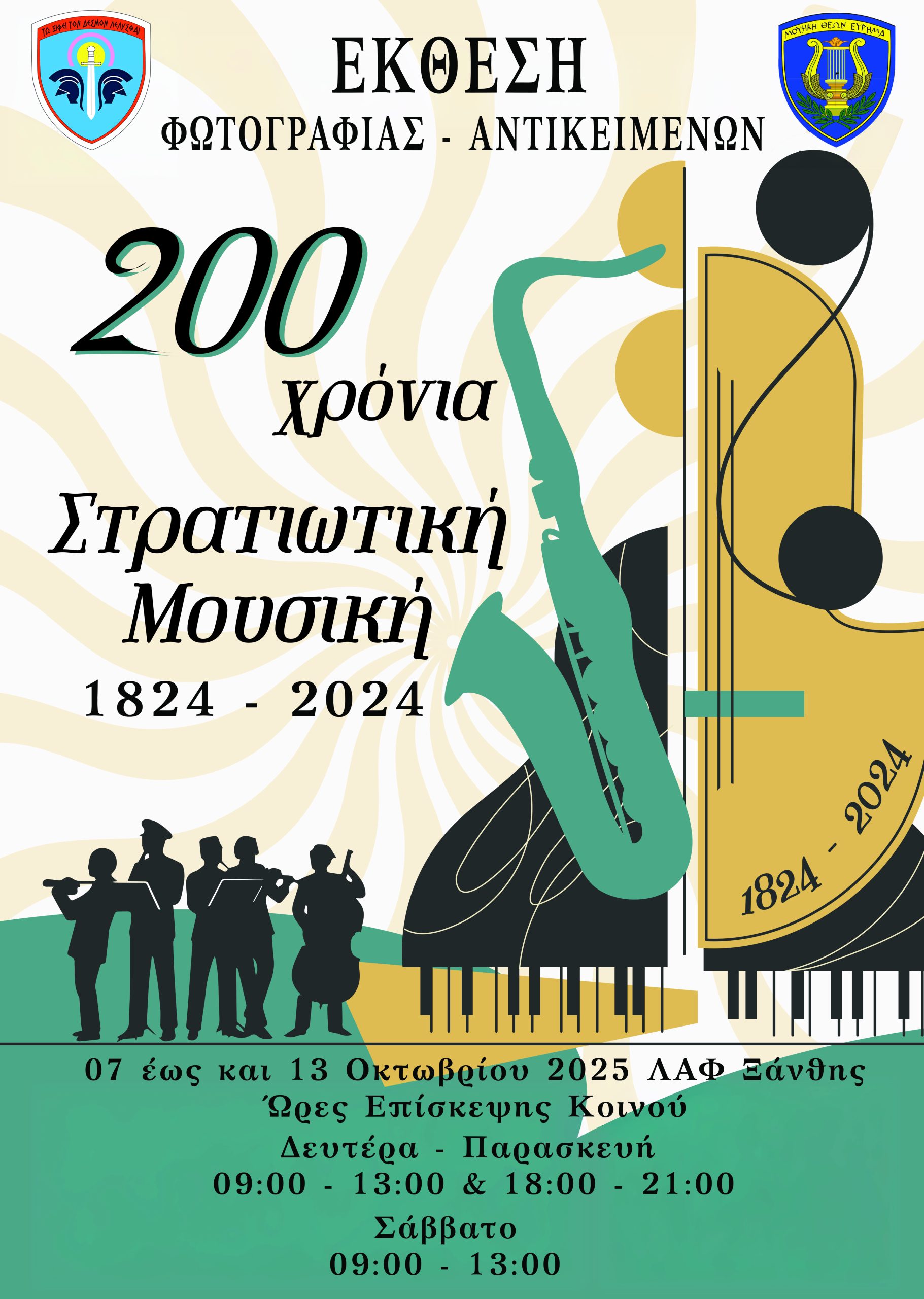 Η έκθεση, που φέρει τον τίτλο «200 χρόνια Στρατιωτικής Μουσικής | 1824-2024», θα φιλοξενηθεί στη Λέσχη Αξιωματικών Φρουράς (Λ.Α.Φ.) Ξάνθης, από την Τρίτη 7 Οκτωβρίου έως και τη Δευτέρα 13 του μήνα.