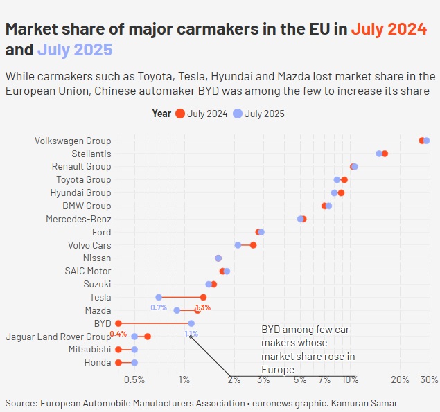 Εν τω μεταξύ, η κινεζική BYD τριπλασίασε τις πωλήσεις της, φθάνοντας το 1,2% της αγοράς και ξεπερνώντας την Tesla για πρώτη φορά στην Ευρώπη.