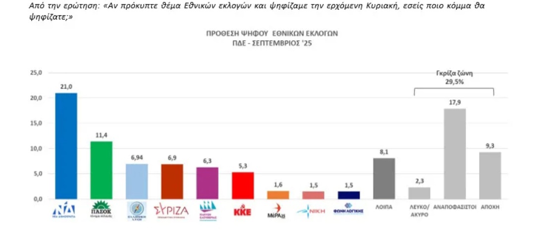 Το ΠΑΣΟΚ είναι δεύτερο κόμμα, σχεδόν με 10% λιγότερη δύναμη από τη ΝΔ. Ενισχυμένες η Ελληνική Λύση και η Πλεύση Ελευθερίας.