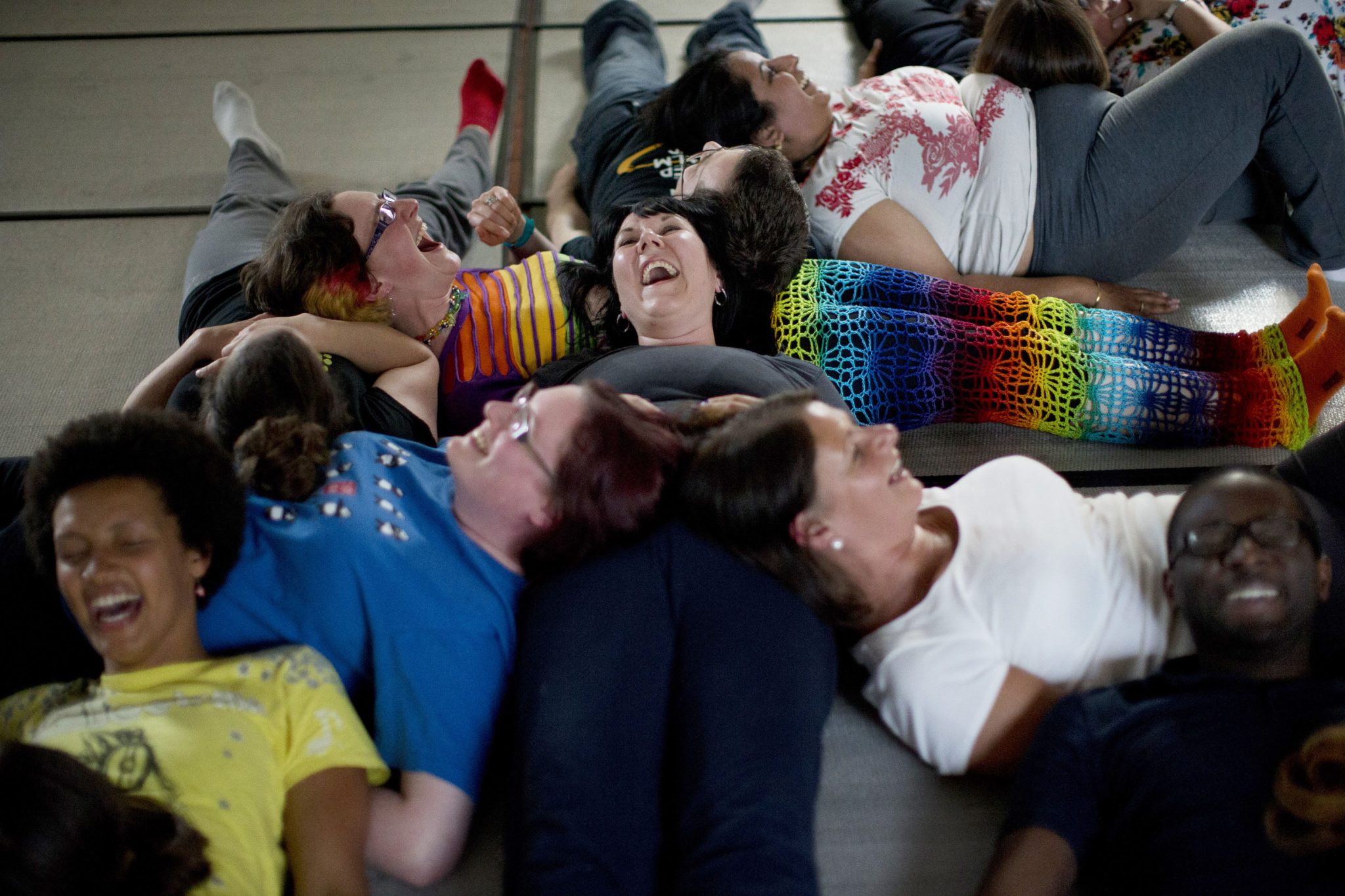 Άνθρωποι γελούν σε ομαδική άσκηση, στη διάρκεια μαθήματος «γιόγκα γέλιου» στο Σεντ Άλμπανς, στην Αγγλία. Η γιόγκα γέλιου ξεκίνησε στην Ινδία το 1995 από τον γιατρό Μαντάν Κατάρια, ως απάντηση σε μια σειρά επιστημονικών ερευνών που δείχνουν ότι το γέλιο είναι εξαιρετικά ωφέλιμο για τη σωματική, συναισθηματική και ψυχική ευεξία. (AP Photo/Matt Dunham)
