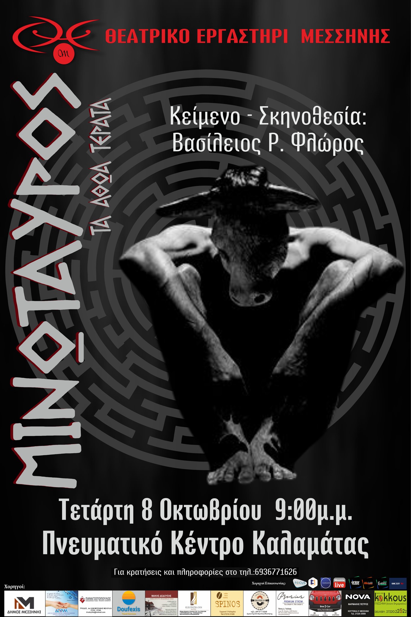 Το έργο «Μινώταυρος – Τα αθώα τέρατα» από το Θεατρικό Εργαστήρι Μεσσήνης (Θ.Ε.Μ.), συνεχίζει την περιοδεία του, μετά από την Αρχαία Μεσσήνη, τη Μεσσήνη και τη Δυτική Μάνη, στο Δημοτικό Πνευματικό Κέντρο Καλαμάτας (Αριστομένους 33), την Τετάρτη (8 Οκτωβρίου 2025), στις 21:00.