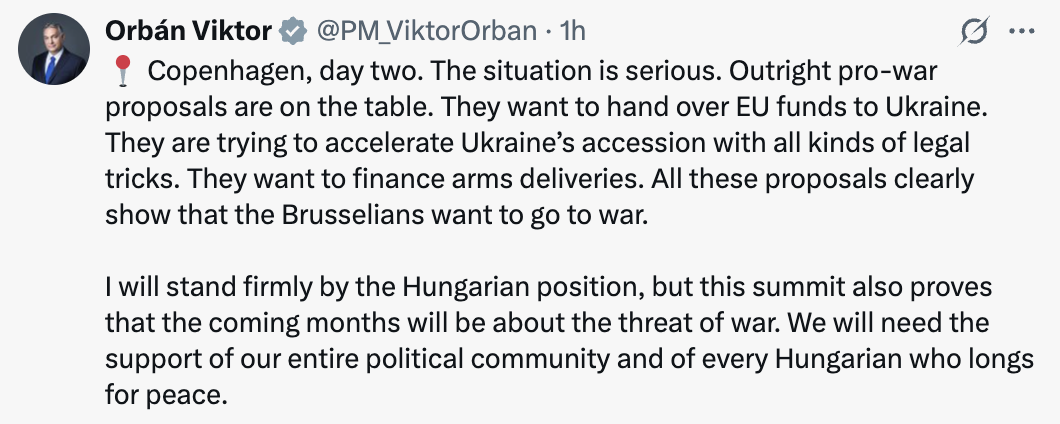 «Κοπεγχάγη, δεύτερη ημέρα. Η κατάσταση είναι σοβαρή. Στο τραπέζι βρίσκονται ανοιχτά πολεμοκάπηλες προτάσεις. Θέλουν να παραδώσουν κονδύλια της ΕΕ στην Ουκρανία. Προσπαθούν να επιταχύνουν την ένταξη της Ουκρανίας με κάθε είδους νομικά τεχνάσματα. Θέλουν να χρηματοδοτήσουν παραδόσεις όπλων. Όλες αυτές οι προτάσεις δείχνουν ξεκάθαρα ότι οι Βρυξέλλες επιθυμούν να οδηγήσουν σε πόλεμο.