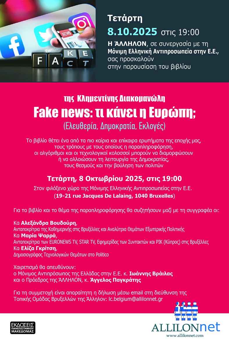Βρυξέλλες: Παρουσίαση του βιβλίου «Fake news: Τι κάνει η Ευρώπη;» της Κλημεντίνης Διακομανώλη