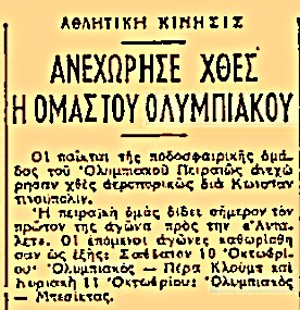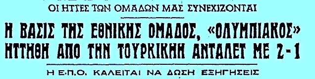 Ας σημειωθή ότι εις την ομάδα του Ολυμπιακού, μετέχουν επτά διεθνείς παίκται, εκ των οποίων οι περισσότεροι, αφού αγωνισθούν και το προσεχές Σαββατοκύριακο εις την Πόλη, θα κληθούν να ενισχύσουν την εθνική μας ομάδα την 18ην τρέχοντος κατά τον αγώνα της με την πανίσχυρον Γαλλικήν. Εξ άλλου εις την Πάτρα η προεθνική μας, παρ’ ολίγον να ηττηθή από την τοπικήν μικτήν ομάδα, την οποία ενίκησε τελικώς με 3-2».