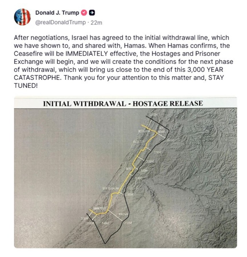 Ο Τραμπ το βράδυ του Σαββάτου ανακοίνωσε πως το Ισραήλ συμφώνησε να αποσύρει τα στρατεύματά του στην οριογραμμή που προβλέπει η πρώτη φάση της εκεχειρίας και η οποία αποτυπώνεται με κίτρινο χρώμα στον σχετικό χάρτη που περιλαμβάνει η ανάρτησή του.