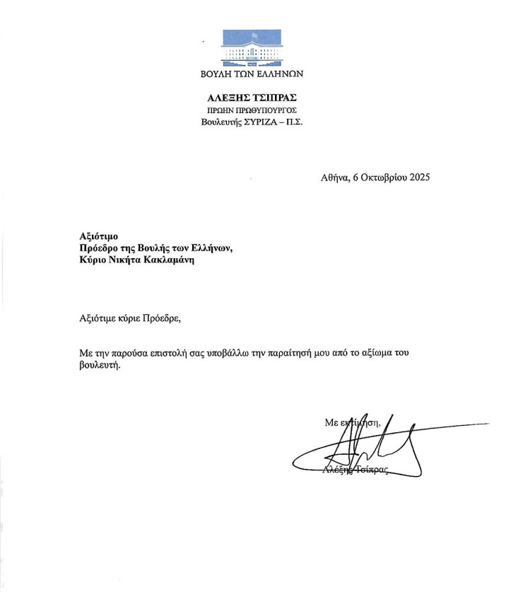 Την παραίτησή του από το βουλευτικό αξίωμα κατέθεσε στον πρόεδρο της Βουλής Νικήτα Κακλαμάνη, ο Αλέξης Τσίπρας πριν την έναρξη της νέας Κοινοβουλευτικής Συνόδου, που ξεκινά σήμερα.