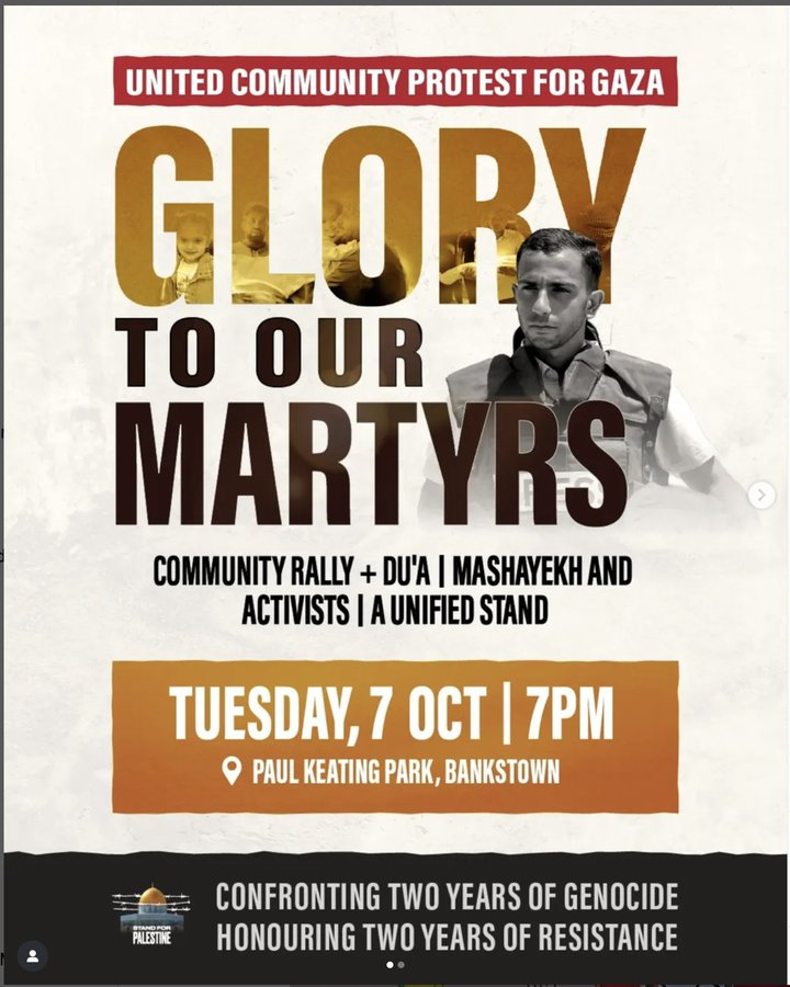 Η οργάνωση Stand for Palestine Australia σχεδιάζει σήμερα το απόγευμα εκδήλωση στο προάστιο Μπάνκσταουν του Σίδνεϊ με τίτλο «τιμή στους μάρτυρές μας», προκαλώντας την καταδίκη του πρωθυπουργού της πολιτείας της Νέας Νότιας Ουαλίας Κρις Μινς.