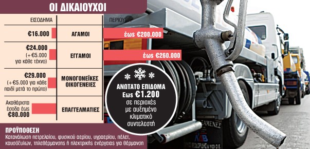 2. Το επίδομα χορηγείται σε φυσικά πρόσωπα άγαμα ή έγγαμα ή σε κατάσταση χηρείας ή σε πρόσωπα που έχουν συνάψει σύμφωνο συμβίωσης ή εν διαστάσει ή διαζευγμένα, τα οποία για τη θέρμανσή τους καταναλώνουν πετρέλαιο εσωτερικής καύσης θέρμανσης ή φωτιστικό πετρέλαιο (μπλε κηροζίνη) ή φυσικό αέριο ή υγραέριο ή καυσόξυλα ή βιομάζα (πέλετ) ή θερμική ενέργεια μέσω τηλεθέρμανσης ή ηλεκτρική ενέργεια και πληρούν τα κριτήρια.